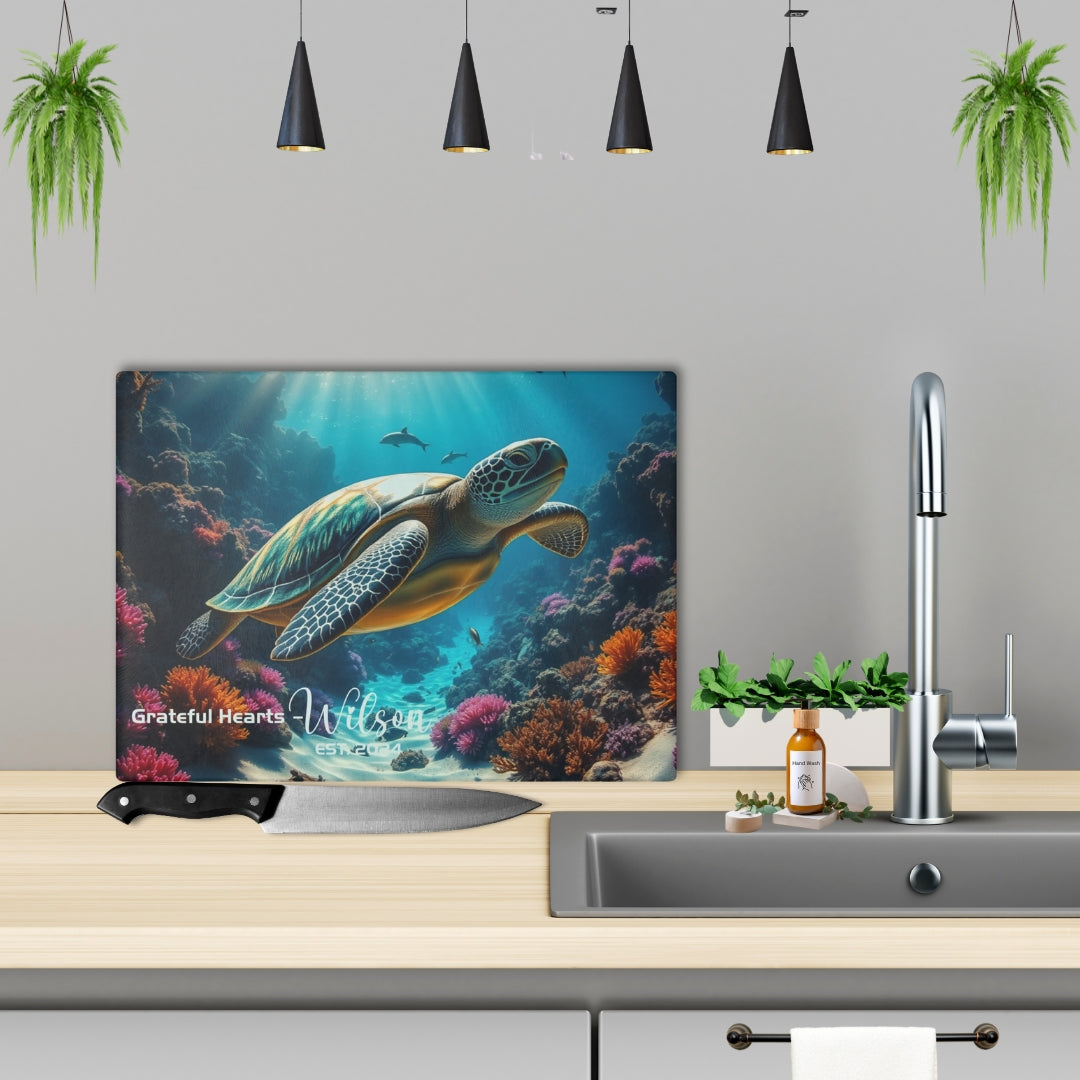 Personalized Cutting Board, "Grateful Hearts" Sea Turtle Glass Cutting Board, Family Name Gifts