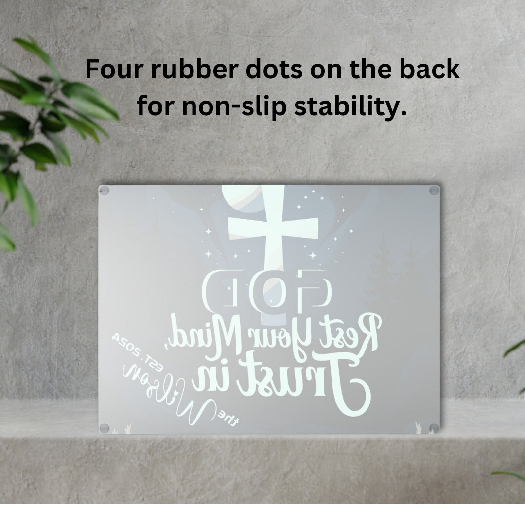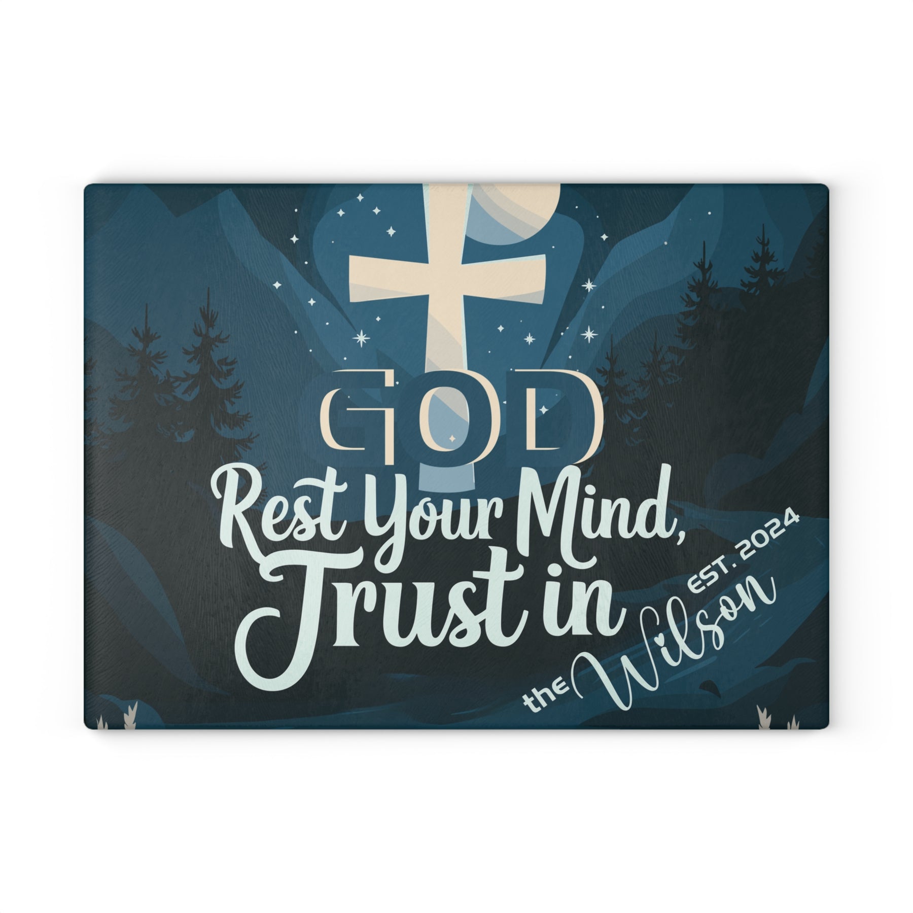 Inspire peace and faith in your kitchen with this personalized glass cutting board featuring the uplifting phrase, "Rest Your Mind, Trust in GOD. the [Family Name], Est. 2024." Crafted from durable tempered glass, this board is not only practical but also serves as a beautiful reminder of trust and unity. Scratch-resistant, non-absorbent, and easy to clean, it’s perfect for daily use or as a decorative display. This meaningful piece makes an ideal gift for housewarmings, holidays, or special family occasions.