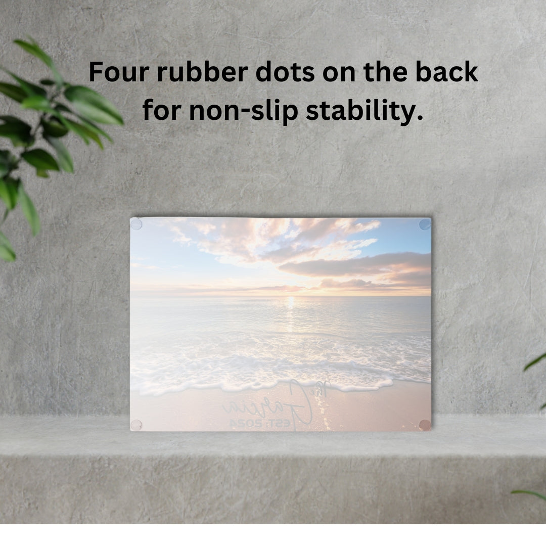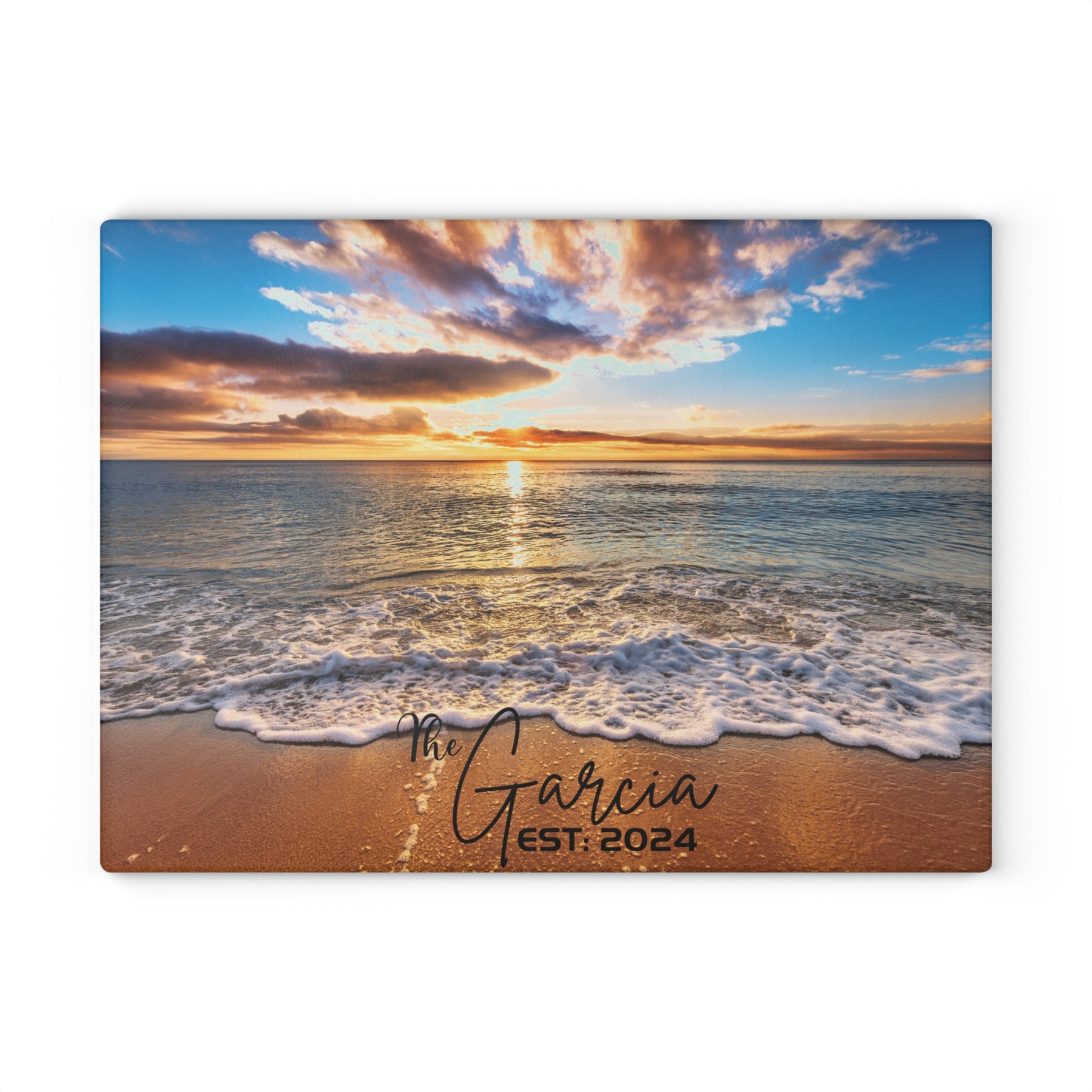 Transform your kitchen with this stunning personalized glass cutting board featuring a serene beach sunset design and the custom text "The Garcia EST: 2024." Crafted from durable tempered glass, it provides a scratch-resistant and non-absorbent surface, making it both practical and beautiful. Available in 8x11 inches and 11x15 inches, it offers ample space for meal preparation while adding a decorative touch when not in use. Perfect for beach lovers, housewarmings, or as a special gift for family, this cutting board will bring elegance and warmth to any home.