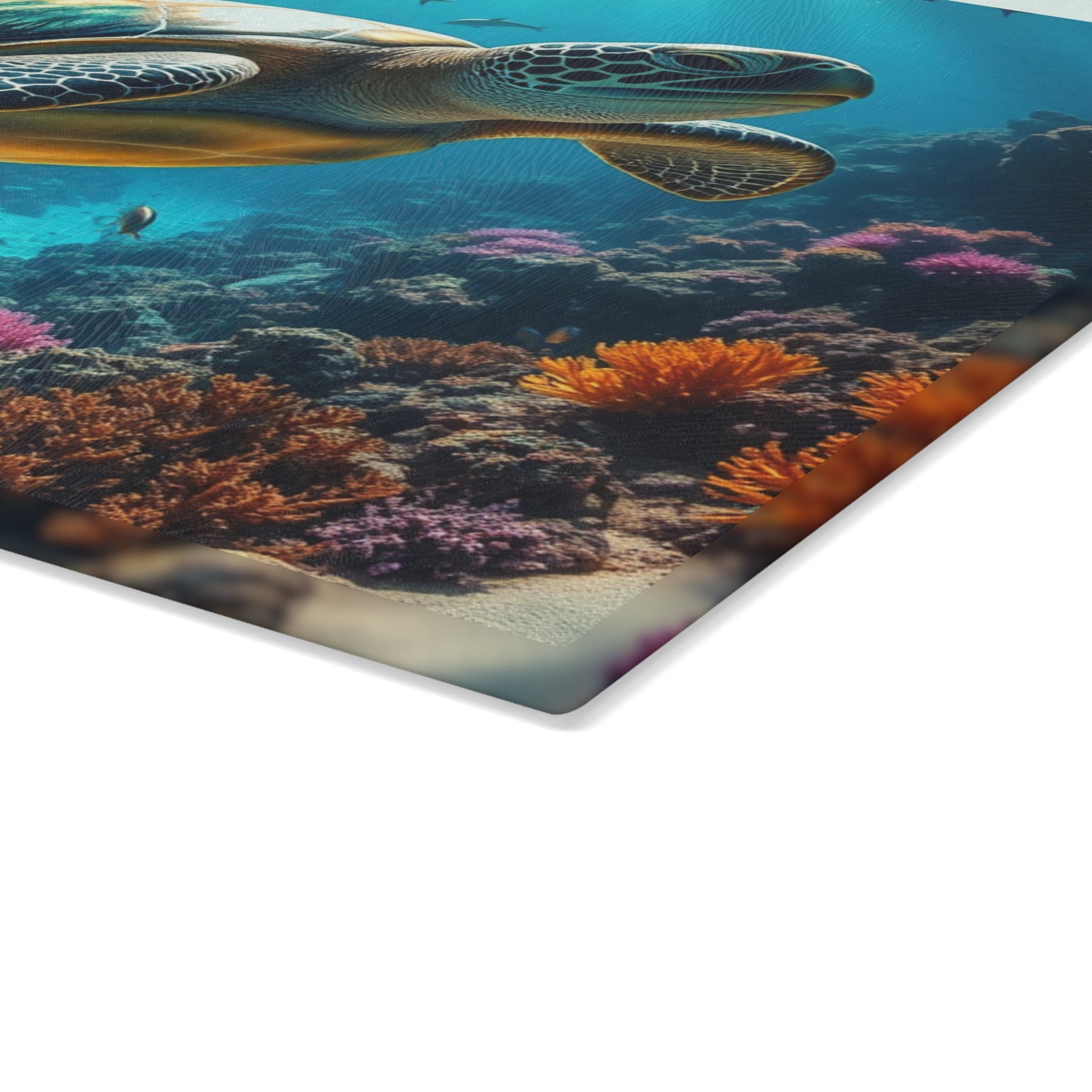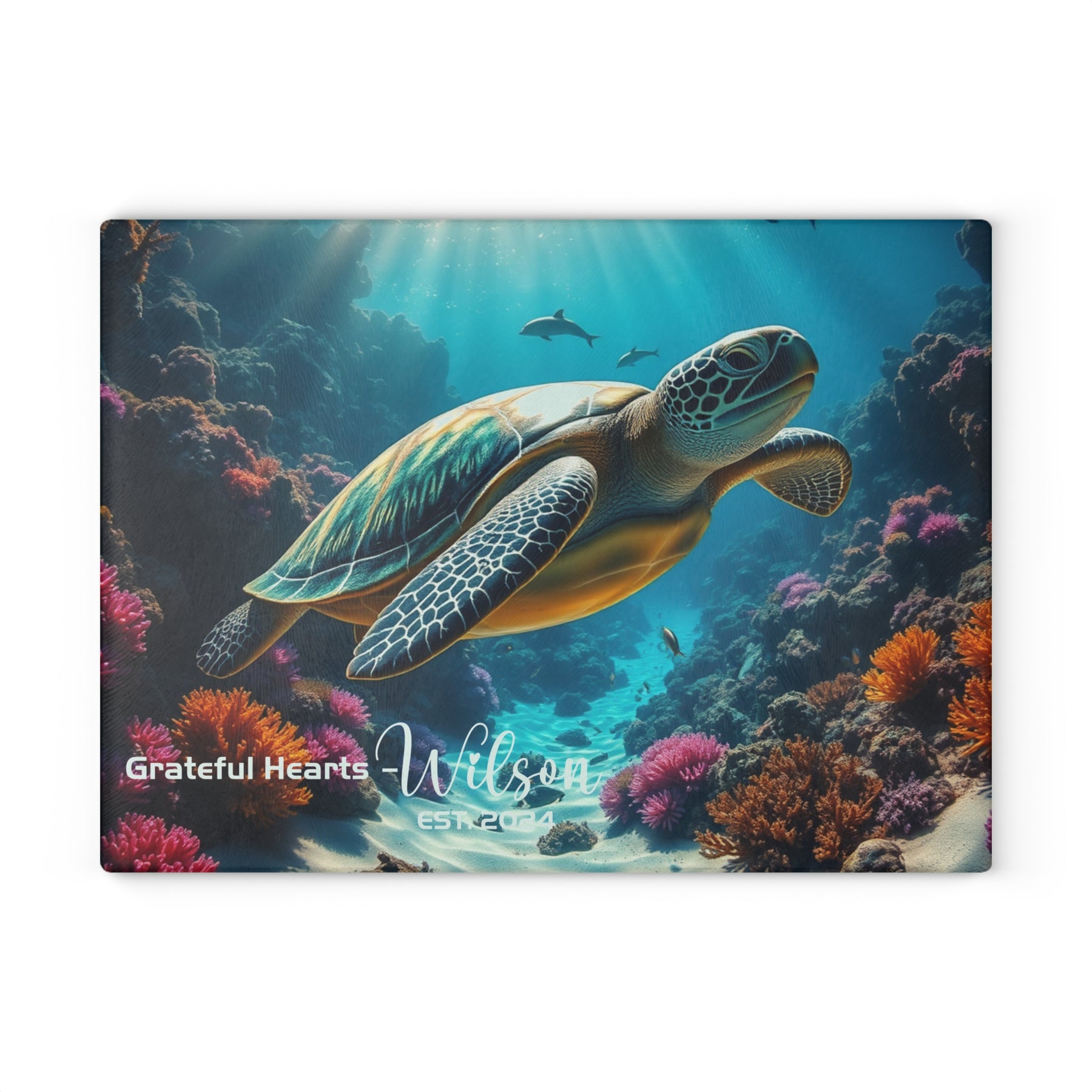 Dive into a touch of ocean serenity with this personalized glass cutting board, featuring a stunning sea turtle and vibrant coral reef scene, complete with your family name and year. Made from durable tempered glass, this cutting board is scratch-resistant, non-absorbent, and easy to clean, making it perfect for meal prep and decorative display. Available in sizes 8x11 inches and 11x15 inches, it brings the beauty of the underwater world to your kitchen. Ideal as a housewarming or special gift for ocean lovers and those who appreciate unique, personalized home decor.