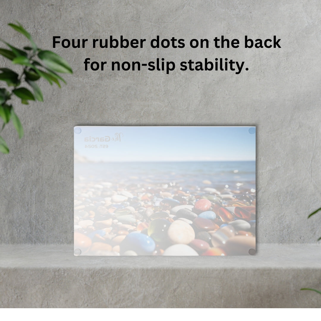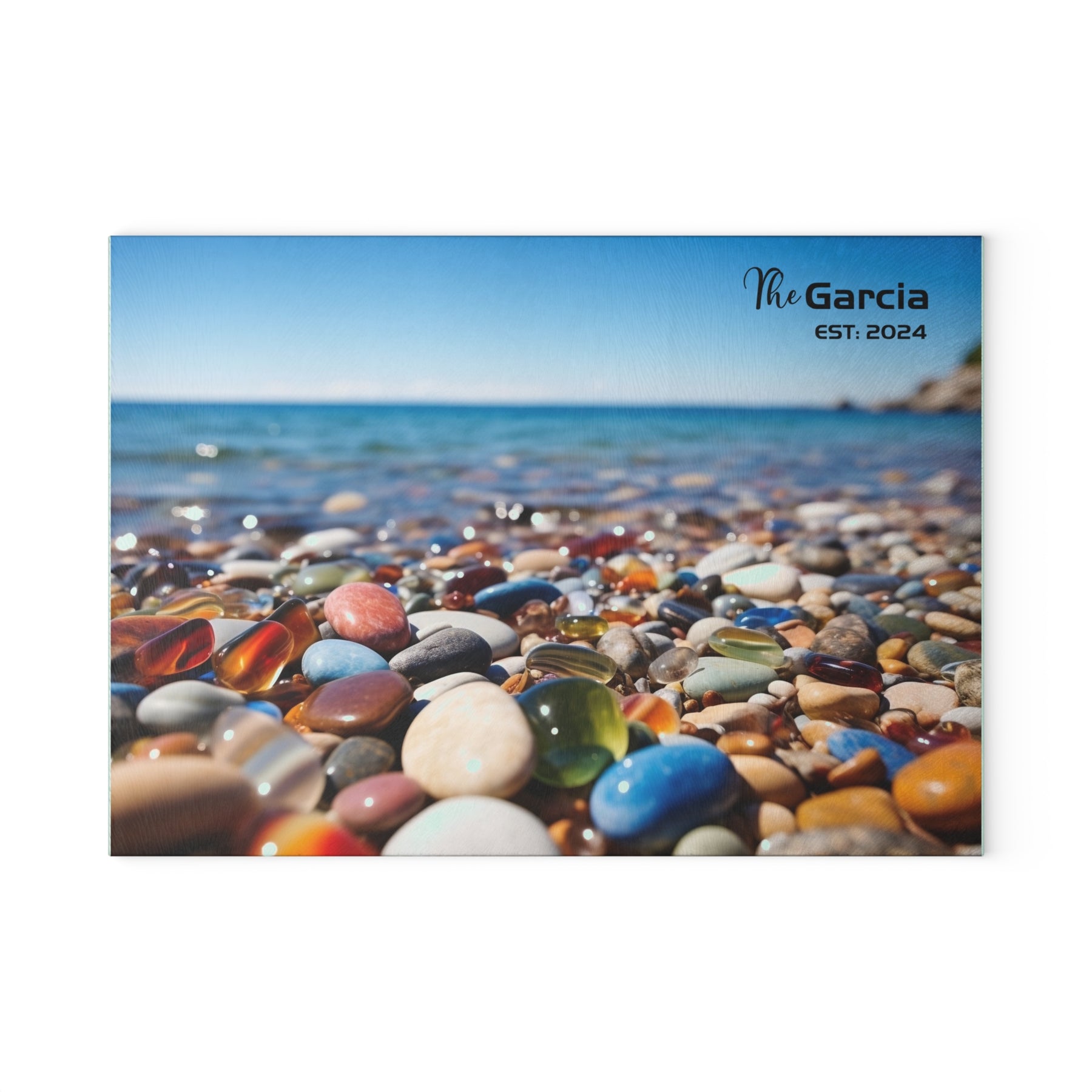 Add a coastal charm to your kitchen with this beautiful glass cutting board featuring a stunning beach scene with colorful pebbles and "The Garcia EST: 2024" personalization. Made with durable tempered glass, this cutting board is both functional and decorative, perfect for prepping meals or serving appetizers in style. Available in two sizes, 8x11" and 11x15", this board is designed to withstand daily use while bringing a unique, artistic touch to your home. It’s a thoughtful gift idea for new homeowners, beach lovers, or anyone looking to elevate their kitchen decor.