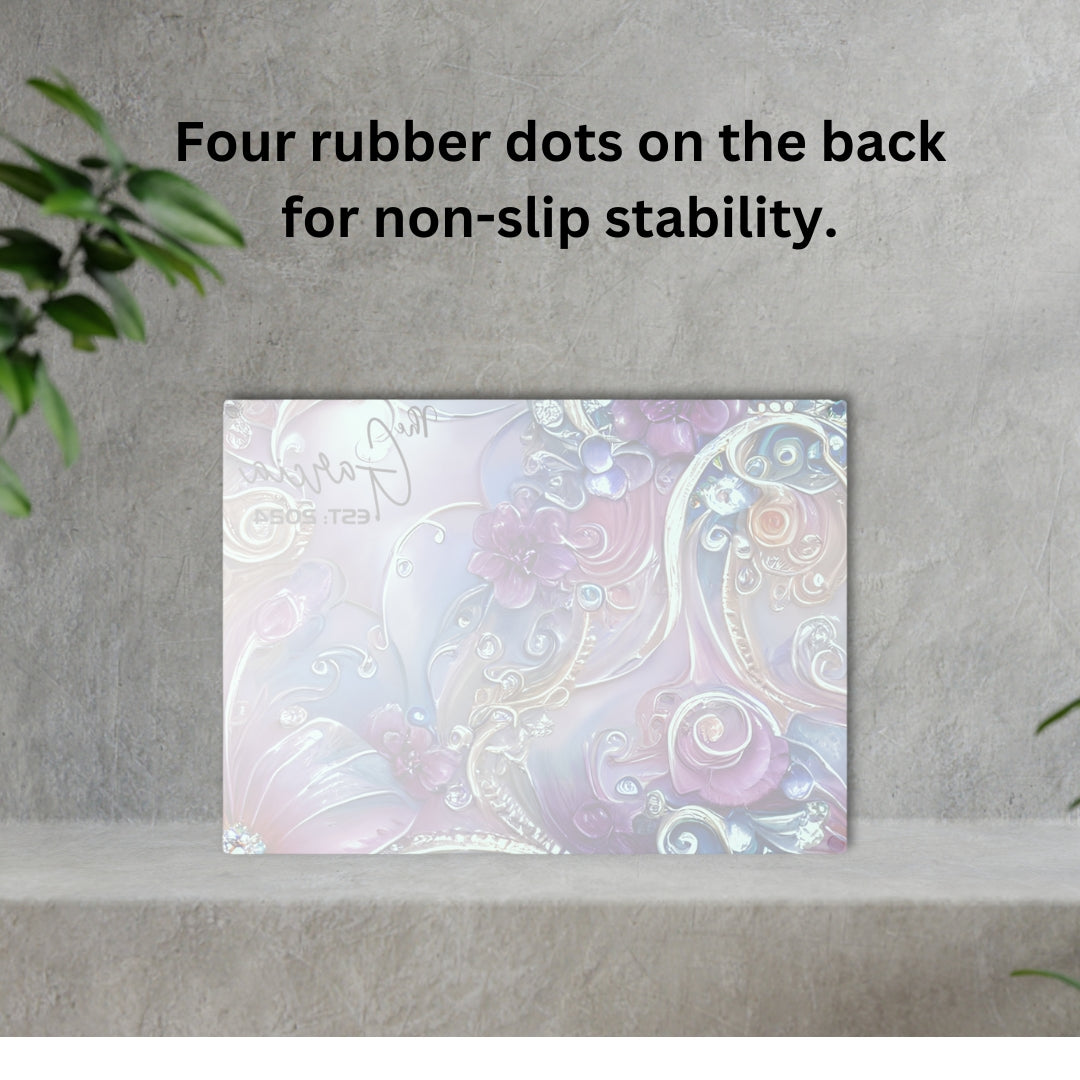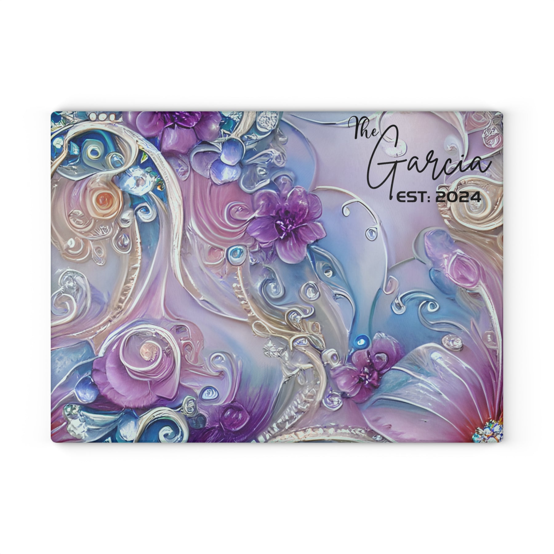 Elevate your kitchen decor with this exquisite personalized glass cutting board featuring a stunning floral design and custom family name. Crafted from high-quality tempered glass, this board combines beauty and durability. The non-absorbent, stain-resistant surface is easy to clean, ensuring it remains a pristine addition to your countertop. Available in two sizes, 8x11 inches and 15x11 inches, it provides ample space for food prep while adding a decorative touch to your kitchen. Perfect as a unique, thoughtful gift for family or friends who appreciate artful, functional decor.