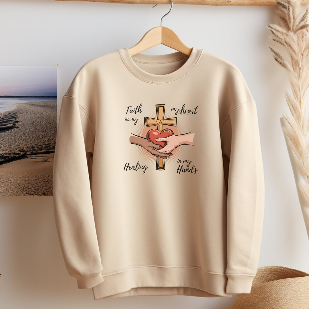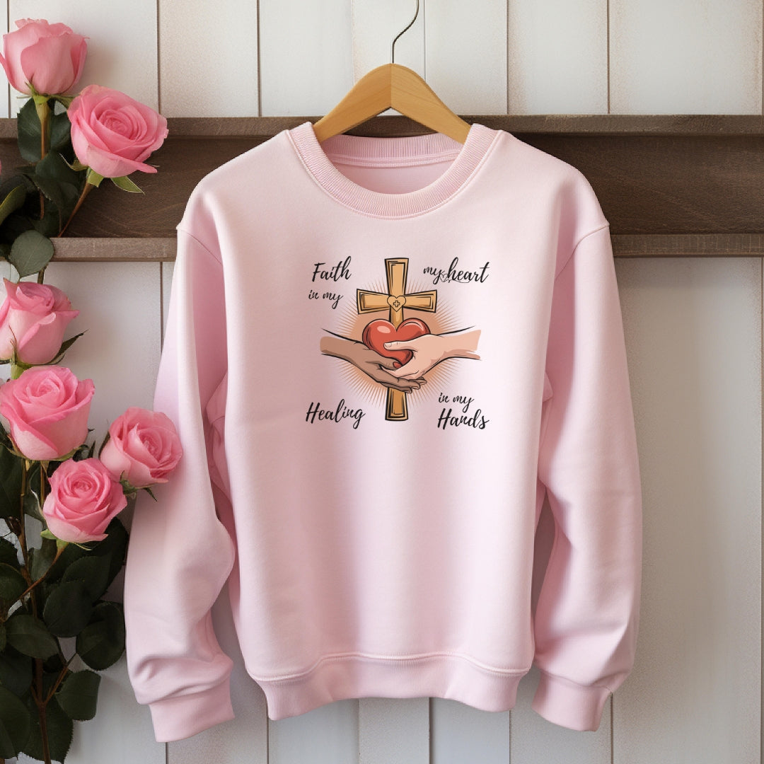 This cozy sweatshirt design, perfect for nurses and those in the medical field, features a heartfelt message of faith, healing, and hope. With a cross symbol and a hand holding a heart, the artwork embodies the spirit of compassion, care, and strength. The phrases “Faith in my heart” and “Healing in my hands” reflect the dedication and commitment of healthcare professionals. Ideal for gift-giving or personal wear, this faith-inspired sweatshirt offers comfort and style for those who bring healing to others.