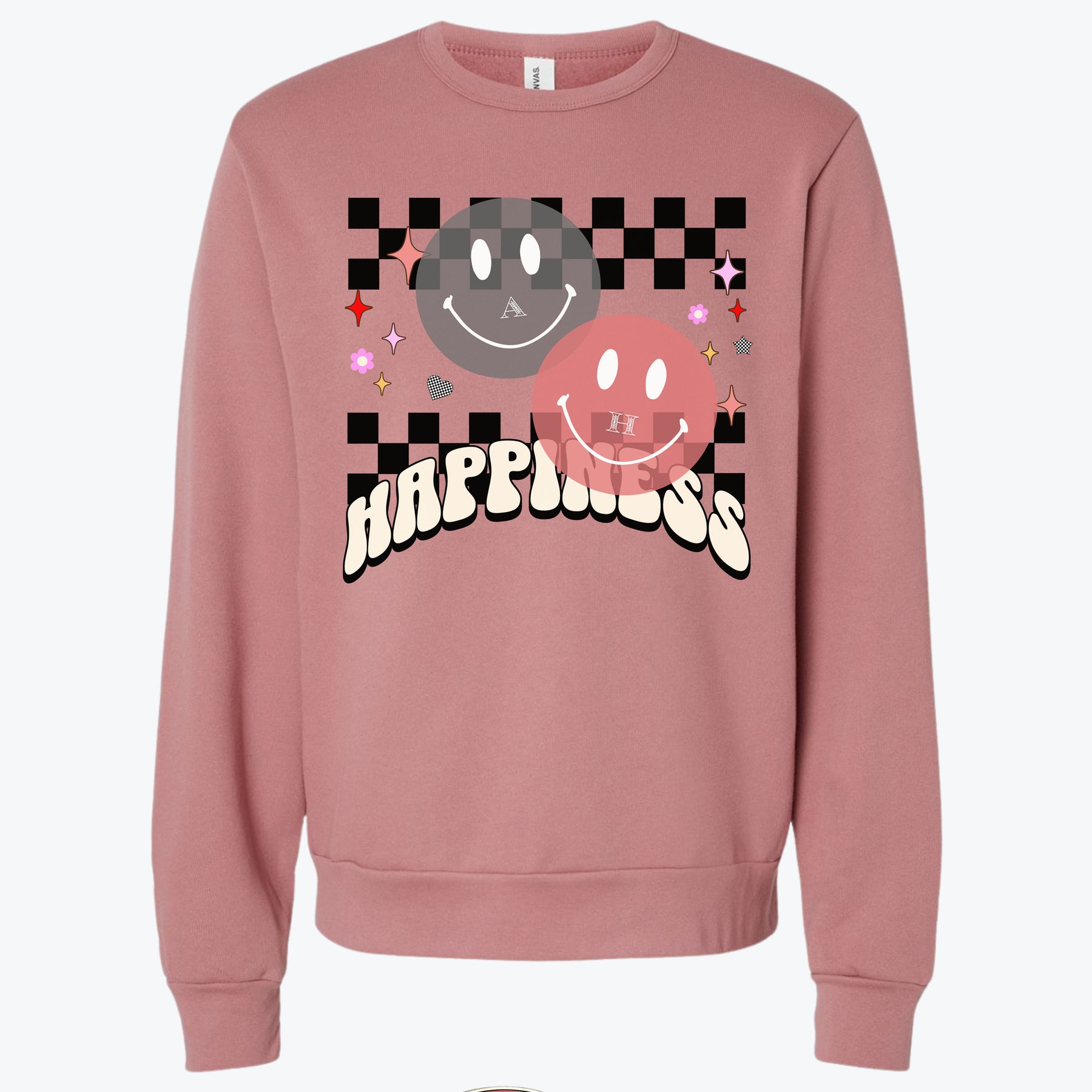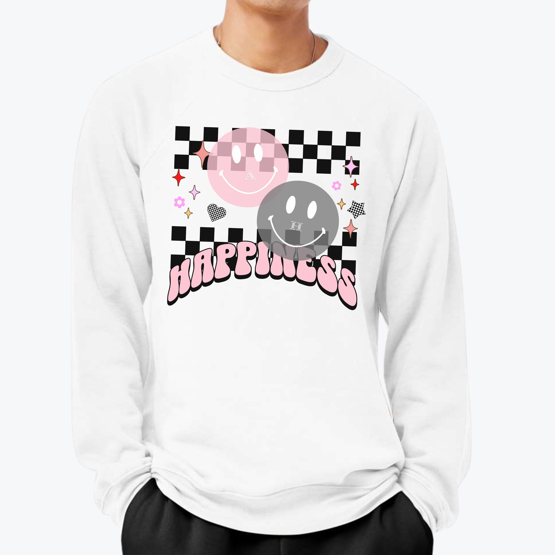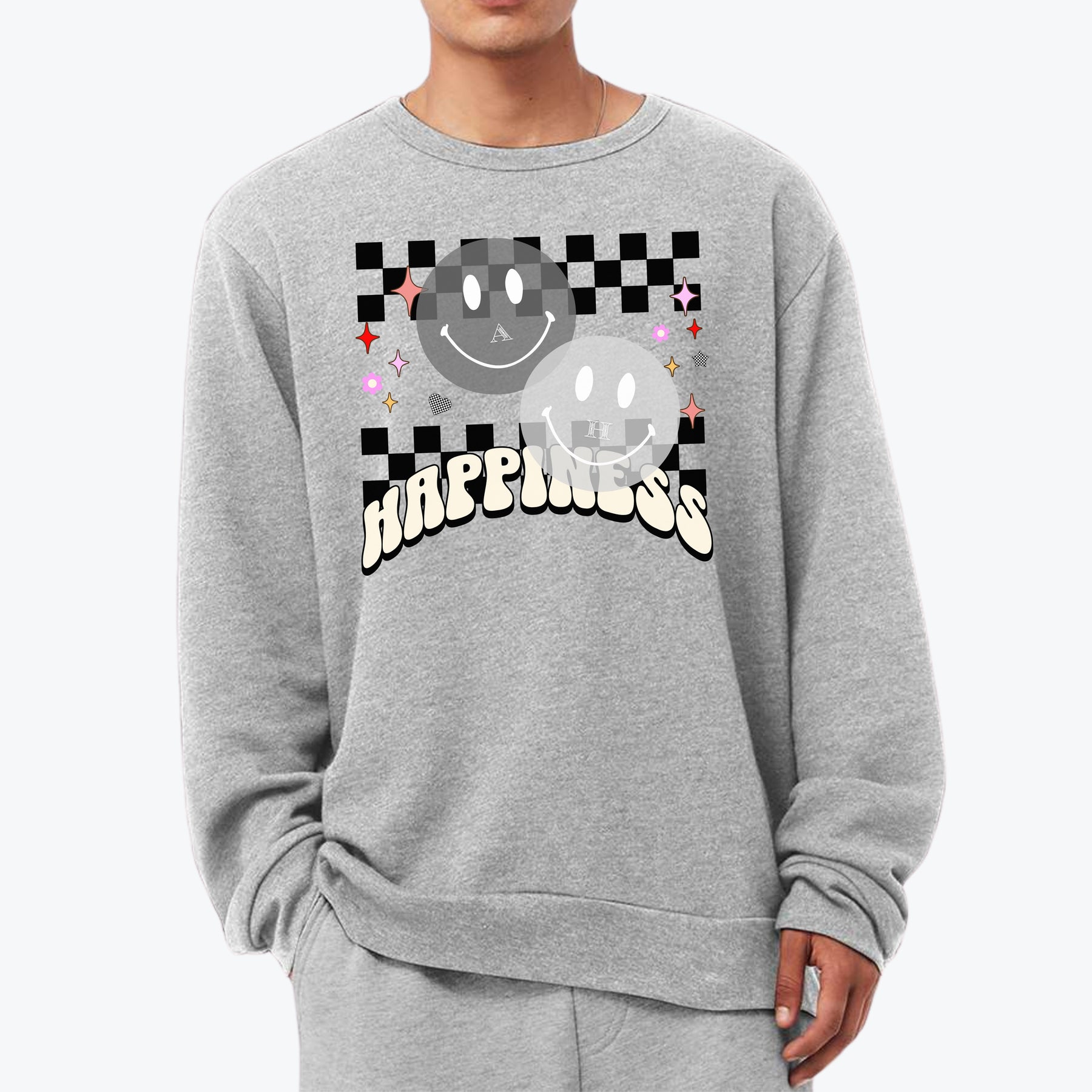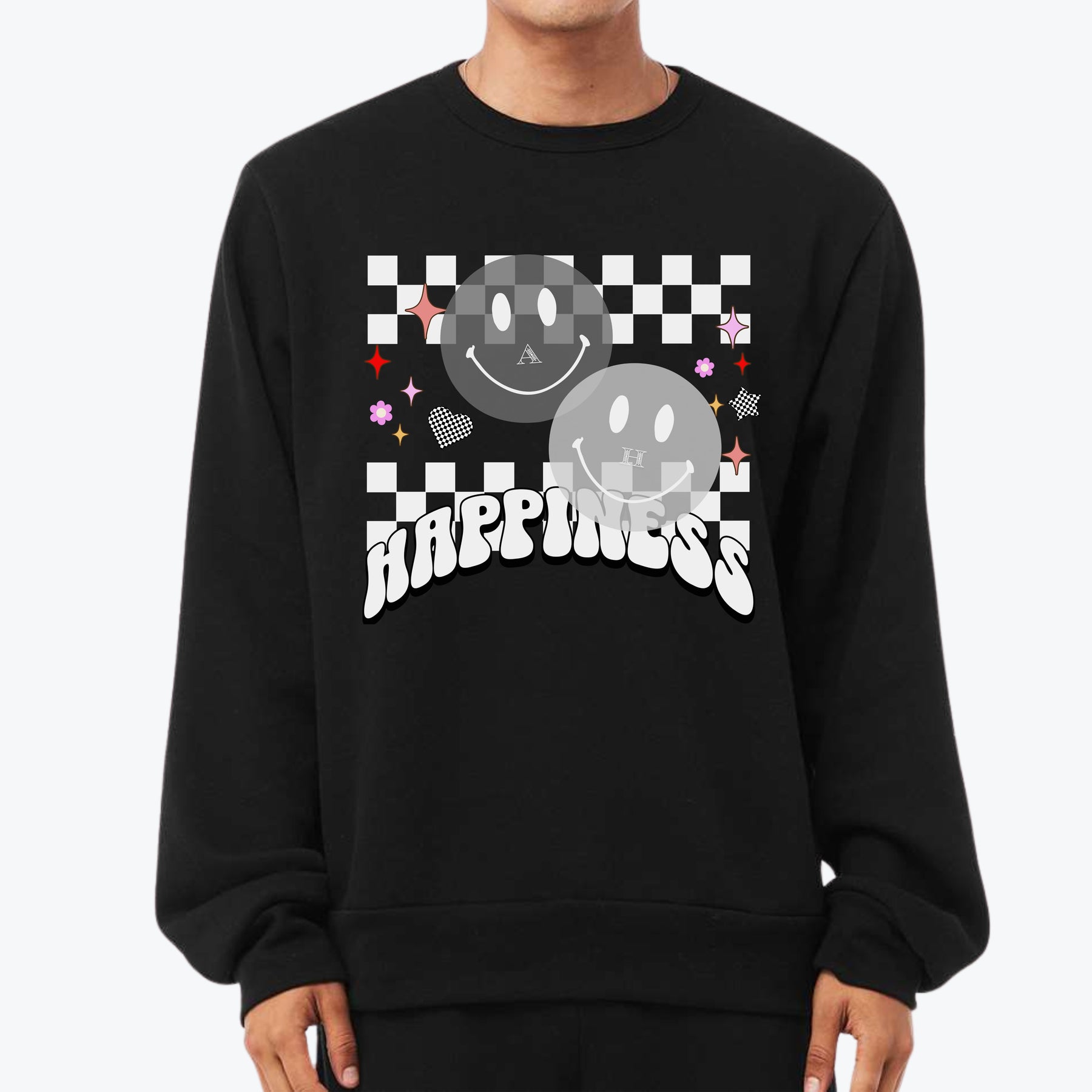 Spread joy with our retro-inspired 'Happiness' sweatshirt! Featuring bold checkered patterns, playful smiley faces, and colorful stars, this cozy design is perfect for adding a fun and positive vibe to your wardrobe. Made with premium-quality fabric, this unisex sweatshirt combines comfort and style, making it a must-have for casual wear. Stay trendy and cheerful with this unique, eye-catching graphic design!