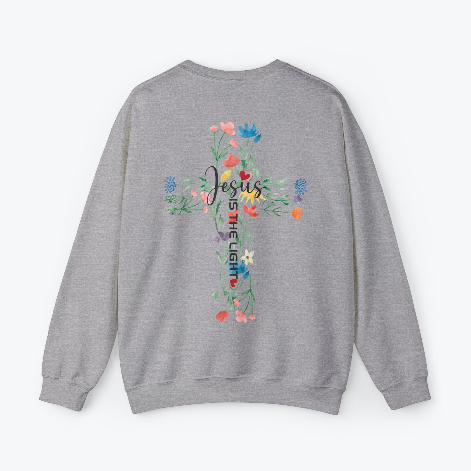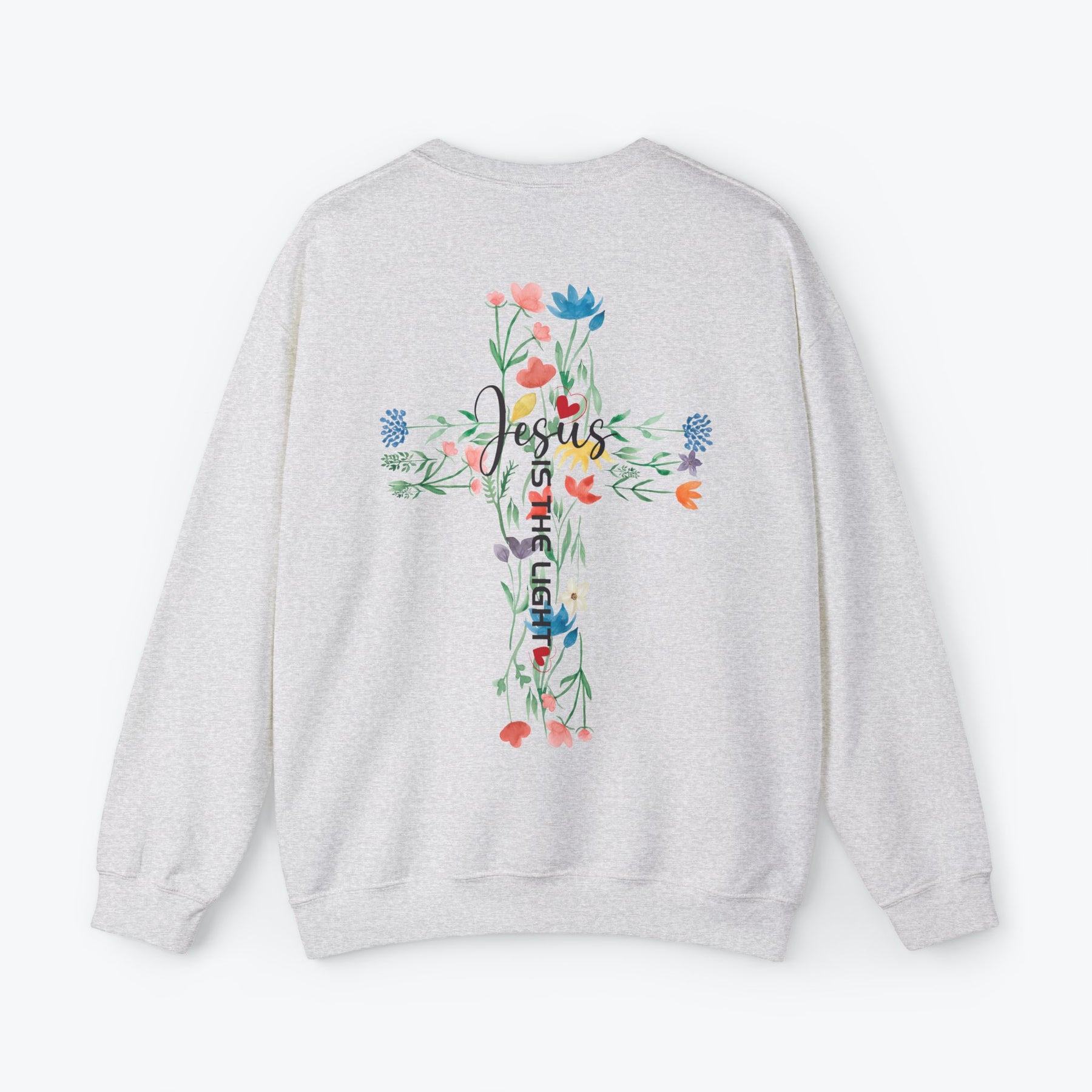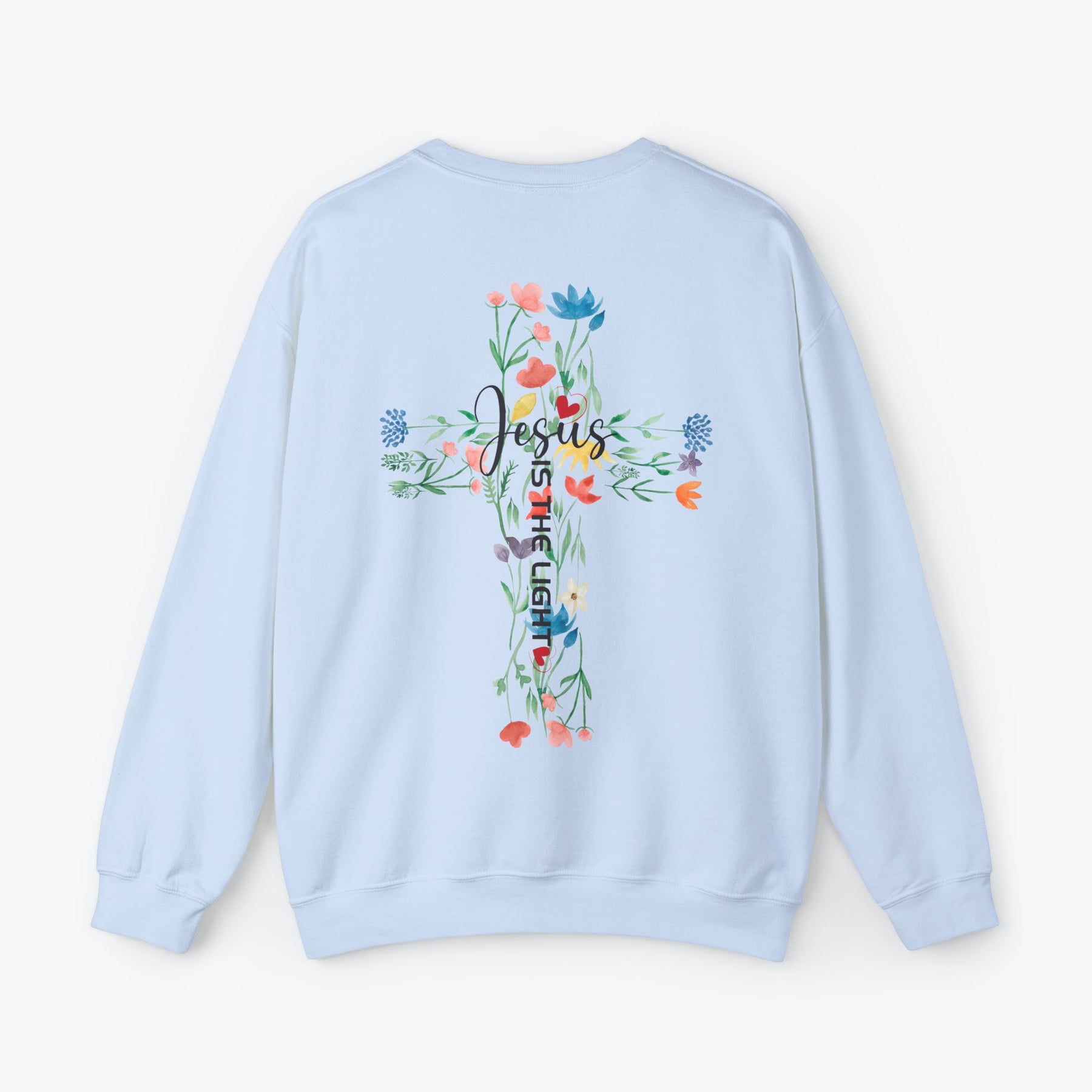 Embrace your faith in style with this "Jesus is the Light" sweatshirt, beautifully printed with a minimalist design on the front pocket and a vibrant floral cross on the back. Made for comfort and inspiration, this trendy Christian sweatshirt is available in 7 different colors to suit your personal style. Perfect as a faith-filled gift for loved ones or a meaningful addition to your wardrobe. Great for pairing with jeans or layering for all seasons.