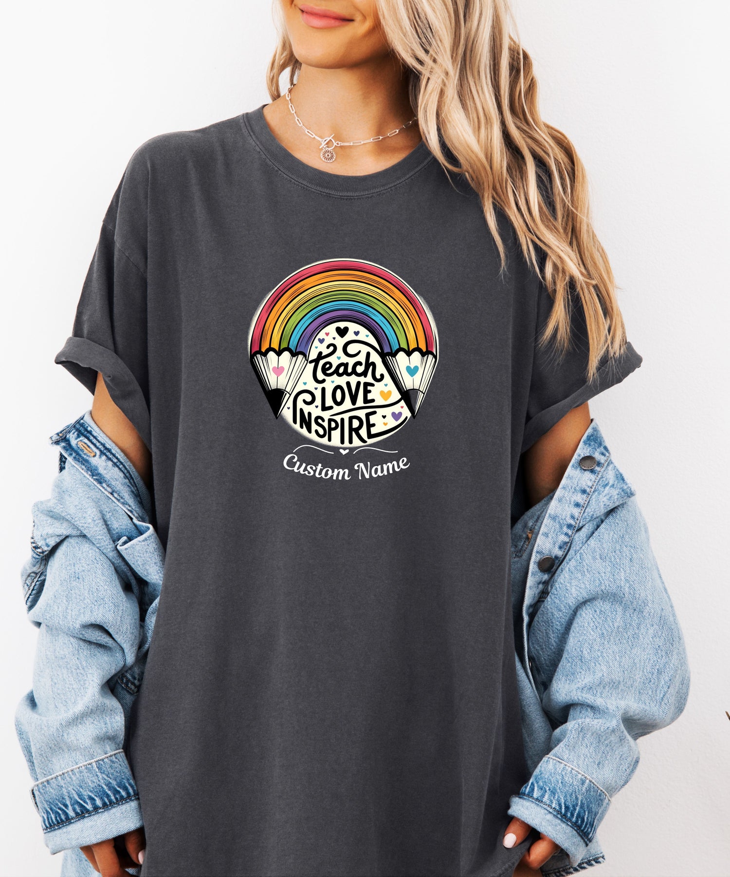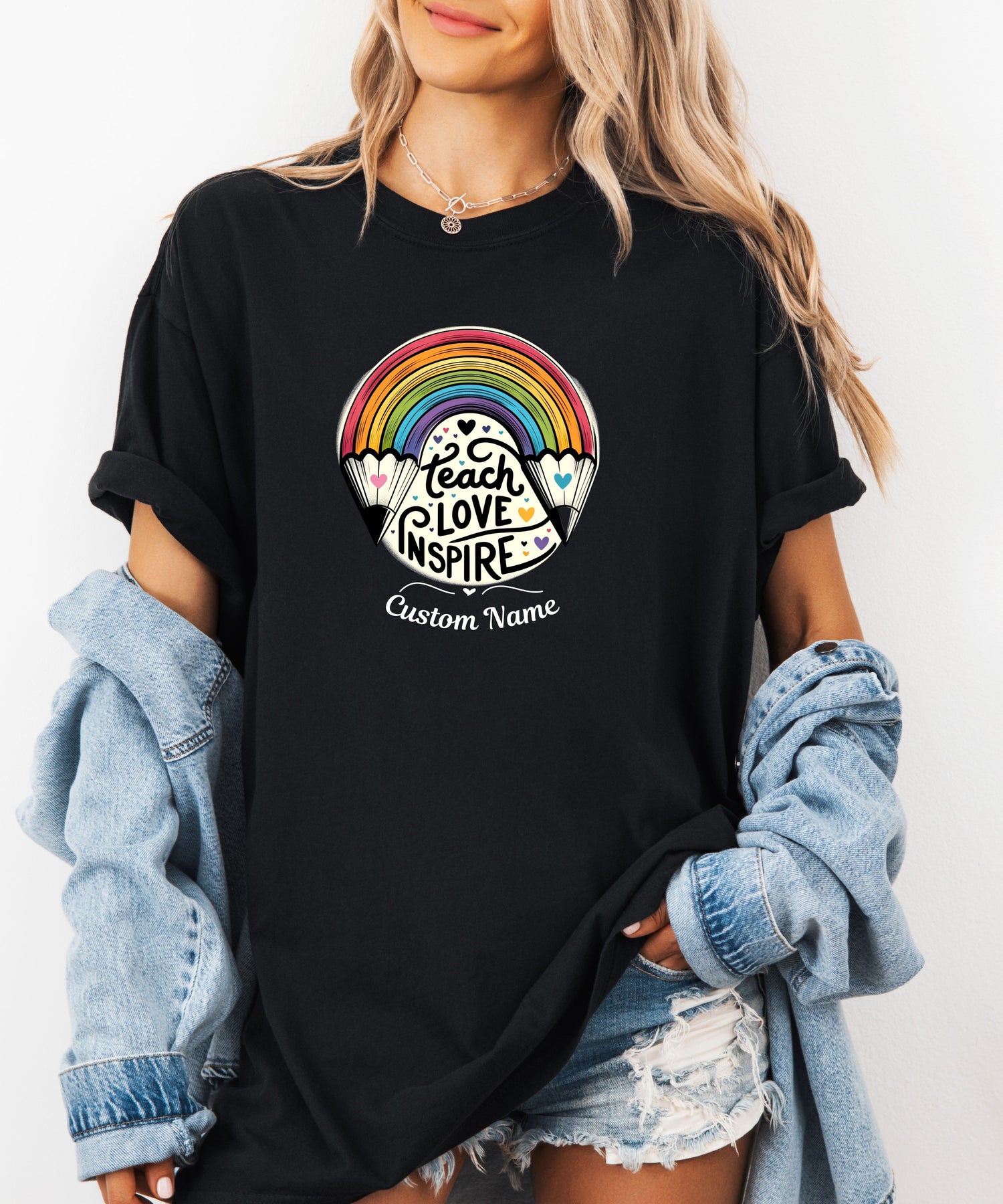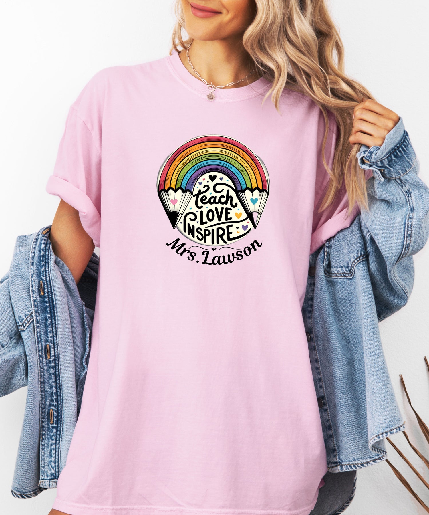 This personalized teacher shirt design features a colorful rainbow graphic framed by two pencils, with the inspiring message "Teach Love Inspire" at its center. The shirt can be customized with the teacher's name, making it a perfect gift for educators.  Ideal for back-to-school season or teacher appreciation gifts.